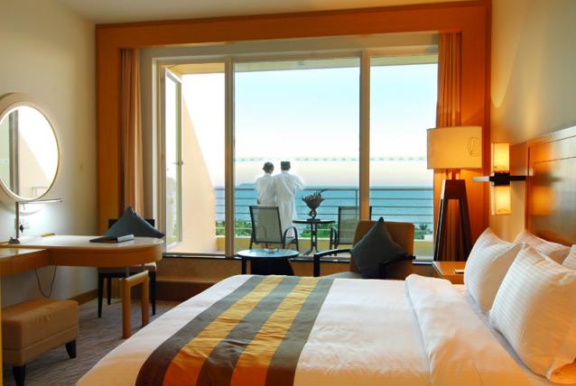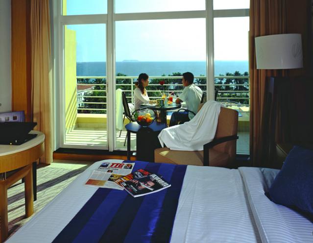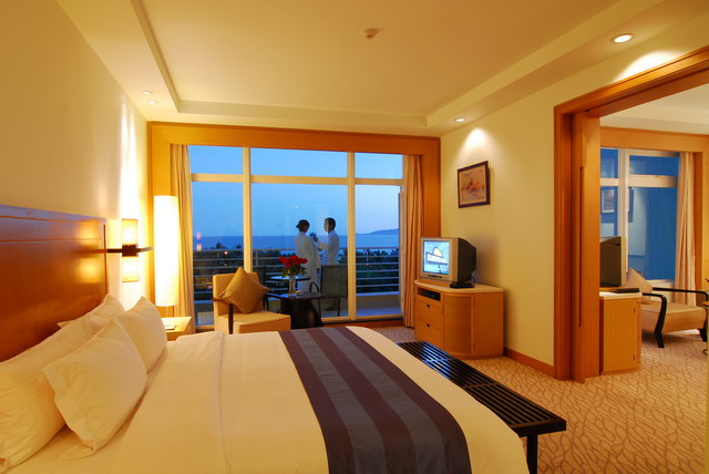 高级海景房,面积42平方米,楼层3-4层,有阳台,180度海景,前面有遮挡物,大床(1.8*2米),双床(1.2*2米),有浴缸,免费宽带