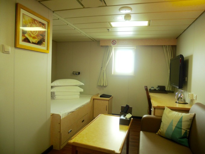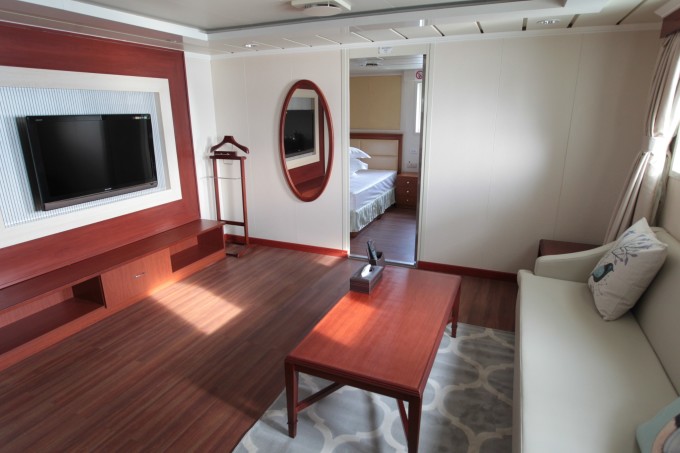 房型二:豪华海景套房B ▲ 房间设施:海景窗 | 独卫 | 洗漱盆 | 电冰箱 | 电视机 | 写字台 | 衣柜 | 沙发 | 茶几 | 行李架 ▲ 可入住人数:2人/间 (备注:可住2人,如住第三人按最低舱位价格收取)